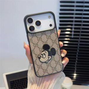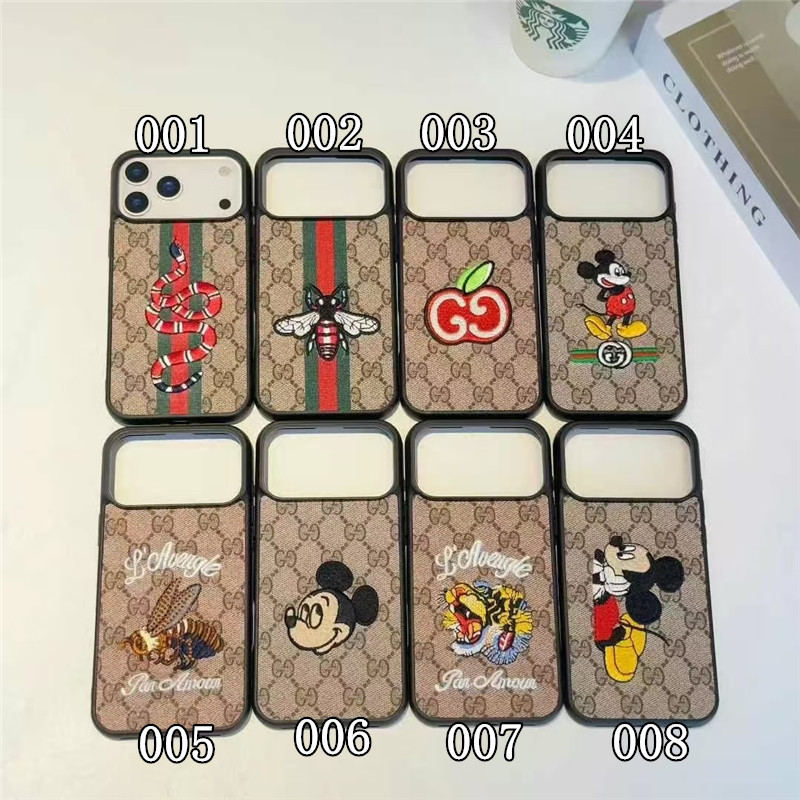 定番のGGパターンのキャンバス素材に蜂、ミッキー、スネークなどの刺繍モチーフをあしらったiPhoneケース。